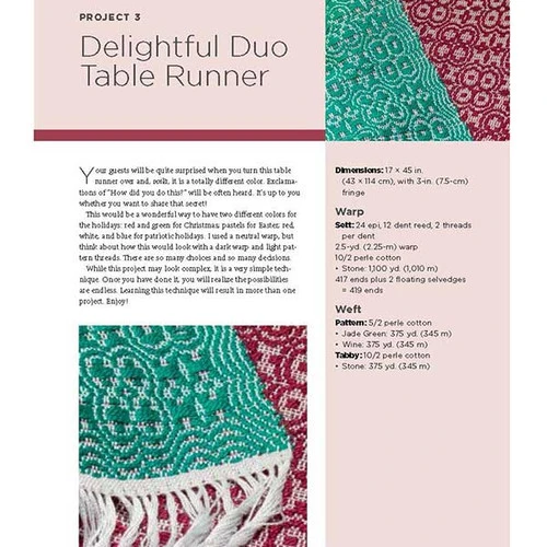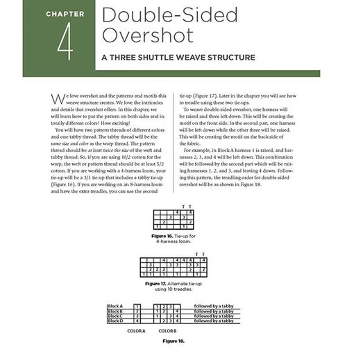 Step out of the weaving comfort zone and experiment with something new! Weave structures often have specific threading and treadling patterns that are unique to that particular weave structure and not shared with others. This book takes you out of the traditional method of weaving overshot patterns by using different treadling techniques. This will include weaving overshot patterns as Summer/Winter, Italian manner, starburst, crackle, and petit point just to name a few. The basic image is maintained in each example but the design takes on a whole new look! Each chapter walks you through the setup for each method and includes projects with complete drafts and instructions so it’s easy to start weaving and watch the magic happen! Try the patterns for scarves, table runners, shawls, pillows and even some upholstered pieces. Once you’ve tried a few projects, you’ll be able to apply what you’ve learned to any piece you desire!