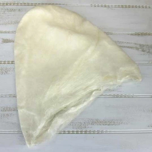 Mulberry silk caps are made from cultivated cocoons degummed and stretched over a wood board shaped like a bell. They consist of a number of extremely thin layers; each layer is one cocoon.