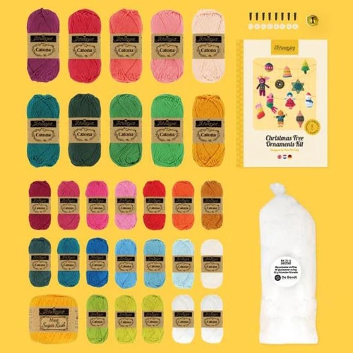 The crochet patterns in this Scheepjes Christmas Tree Ornaments crochet kit were designed by Kate McCully. The cute and cheerful decorations are guaranteed to get you and your home into the Christmas spirit.Â