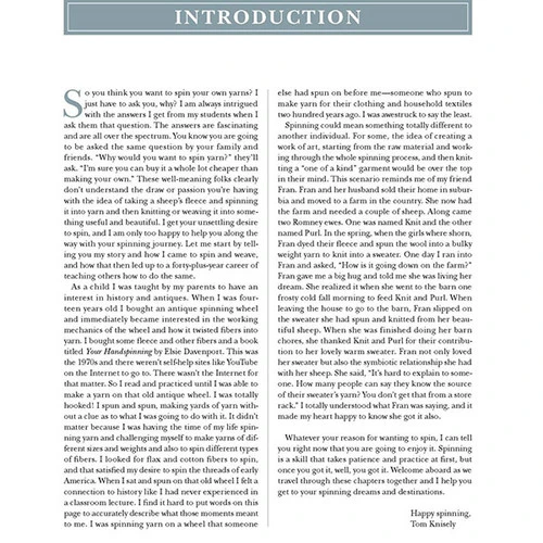 From how to choose a spinning wheel and how to set it up and keep it running smoothly; to how to select and prepare your fiber; how to spin your first yarn, and the various options for how to do so; to plying and finishing—Tom explains it all in simple terms and with helpful visuals. Because Tom has taught so many classes of spinners, he knows all the common pitfalls and addresses them with his troubleshooting tips. At its essence, yarn is fiber with twist added to keep it together, and Tom keeps the whole process as simple as that. You will soon be whirring away, spinning yards and yards of glorious yarn!Â